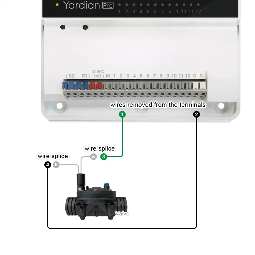 This picture shows how a valve is connected to a zone on the Yardian Pro controller. Simply use a multimeter to measure point 1 and point 2 in the picture with the wires removed from the terminals, which will let you know the overall resistance (including the wiring, the wire splice, and the solenoid coil). You can also measure point 5 and point 6 to get the resistance of the coil to further identify the root cause.